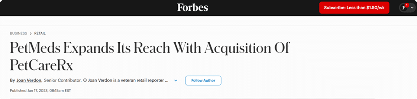 As the primary marketing agency for PetCareRx for around 10 years (!), we successfully maintained consistent traffic growth leading up to its acquisition by PetMeds in January 2023 for $36 million in an all-cash deal.